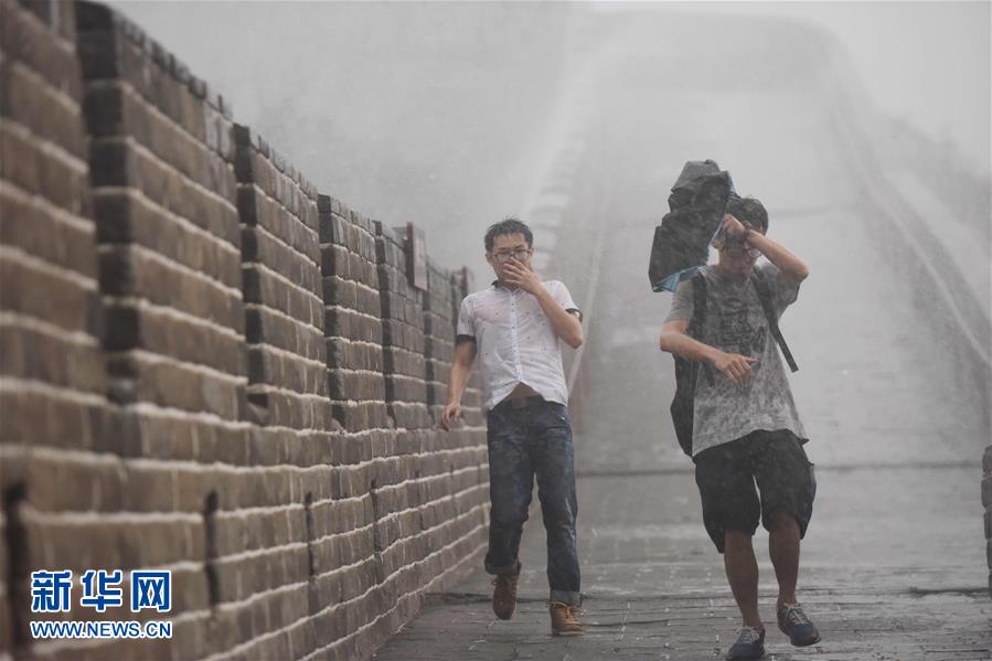6月21日,游客冒雨跑在八达岭长城上。当日傍晚,北京八达岭长城迎来一场夹杂着冰雹的阵雨,雨后天空出现了彩虹。 新华社记者陈晔华摄