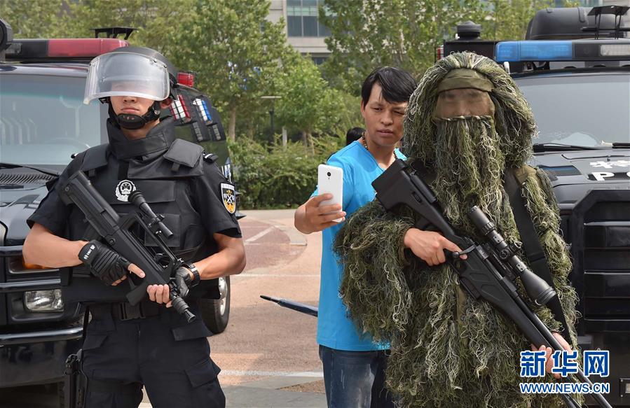 6月23日,反恐宣传周启动仪式上,一位市民和特警合影。当日,北京启动反恐宣传周活动,此次反恐宣传周活动主题是“人人参与反恐,共筑首都平安”。 新华社记者 李文 摄
