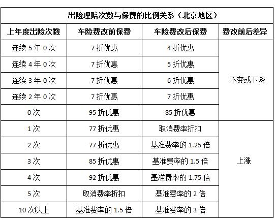 2010年1月1日,北京地区在全国率先实施商业车险费率浮动机制,将理赔次数与保险费率增减挂钩。车辆连续5年不出险,费率浮动系数最低为0.4,最多可以打4折。车辆一年出险8次及以上,保费上浮3倍。