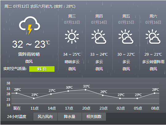 千龙网讯 据北京气象台消息,今天(12日)白天阴有阵雨或雷阵雨转多云,南转北风二三级,最高气温32℃;夜间多云转晴,北风一二级,最低气温23℃。