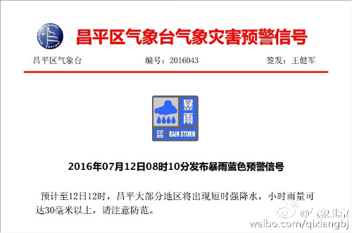 此外,昌平区2016年07月12日08时10分发布暴雨蓝色预警信号。预计至12日12时,昌平大部分地区将出现短时强降水,小时雨量可达30毫米以上,请注意防范。