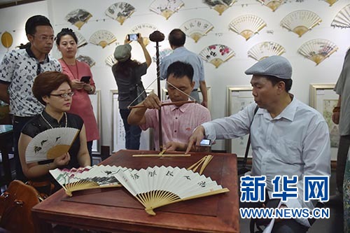 7月15日,北京扇子艺术协会会长郑高现场展示扇子制作工艺。