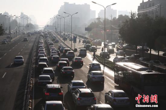 资料图:北京市海淀区玲珑路车行缓慢。 中新社记者 刘关关 摄