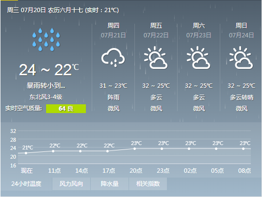 千龙网讯 据北京气象台消息,今天(20日)早晨至白天阴有暴雨,局地大暴雨,东北风二级转三四级,阵风六级;夜间阴有小到中雨;气温24到22℃。