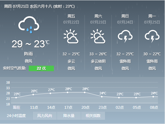 市气象台发布06时预报:今天白天阴有阵雨,北转南风二三级,最高气温29℃;夜间阴有分散性阵雨转多云,南转北风一二级,最低气温23℃。早晨阴有阵雨,早高峰注意交通安全。白天仍有阵雨,出行注意防雨。