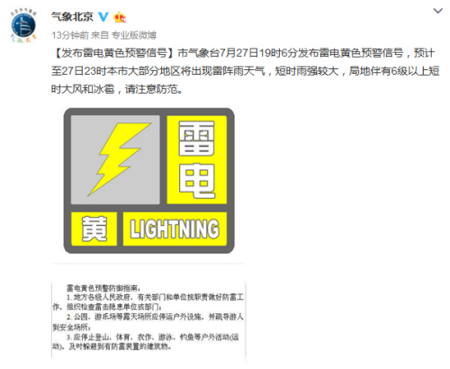 中新网7月27日电 据北京市气象局官方微博消息,北京市气象台7月27日19时6分发布雷电黄色预警信号,预计至27日23时北京市大部分地区将出现雷阵雨天气,短时雨强较大,局地伴有6级以上短时大风和冰雹,请注意防范。