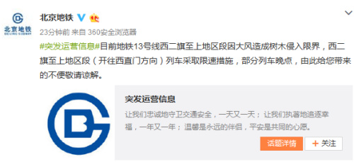 来源标题:北京地铁13号线列车晚点 因大风造成树木侵界