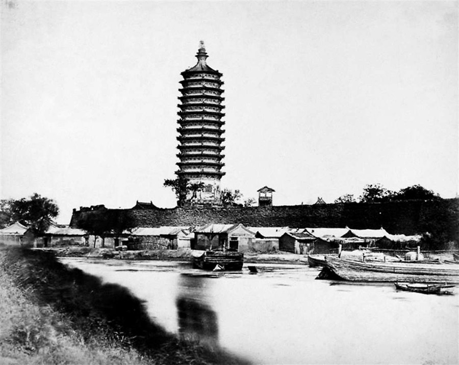通州燃灯佛舍利塔。此片是1860年英法联军攻打北京城时,随军记者费利斯·比托拍摄的,也是北京最早的照片之一。比托站在今天通州西海子公园西门外、通惠河北岸拍摄了这张照片。