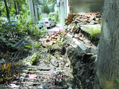 记者注意到,不仅南侧的围墙倒塌,西侧的围墙在雨后也发生倾斜,有倒塌的危险。药店店主为了防止危险,已经把靠近药店的一小段围墙拆掉,碎砖散落在地上。店主说,西侧的围墙没法拆,但随时可能倒塌。如果倒了,就会砸在药店的房子上。