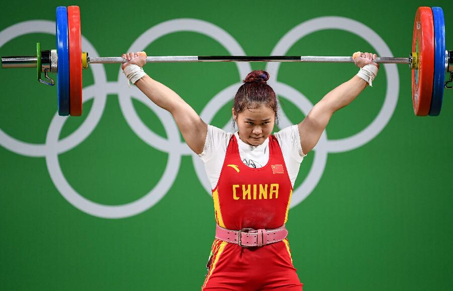 第6金:里约时间 8月9日,中国选手邓薇在比赛中。当日,在里约奥运会女子举重63公斤级决赛中,中国选手邓薇以262公斤的总成绩夺冠,并打破挺举和总成绩两项世界纪录。 新华社记者 王昊飞摄