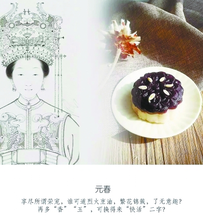 “紫薯、山药、糯米粉、松子、奶油——纹样来自经典广式月饼糕模,造型端雅大气。山药软糯莹润,配以紫薯的绛紫添一分皇家贵气。松瓤香气厚重,也是书中多次出现的点心食材。”——这道点心迎合的是贵气端雅的元春。