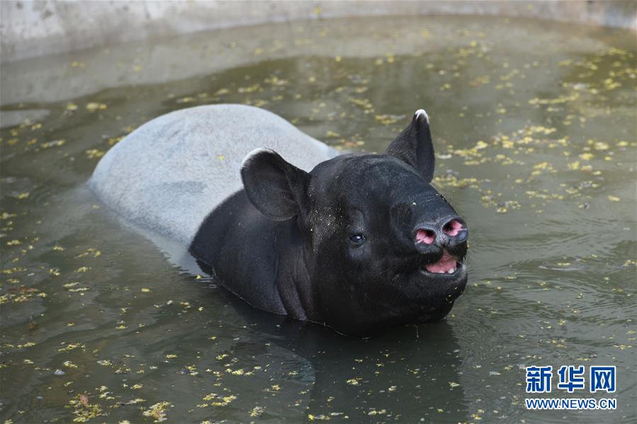 8月10日,北京动物园的一只马来貘浸泡在水池中“消暑”。