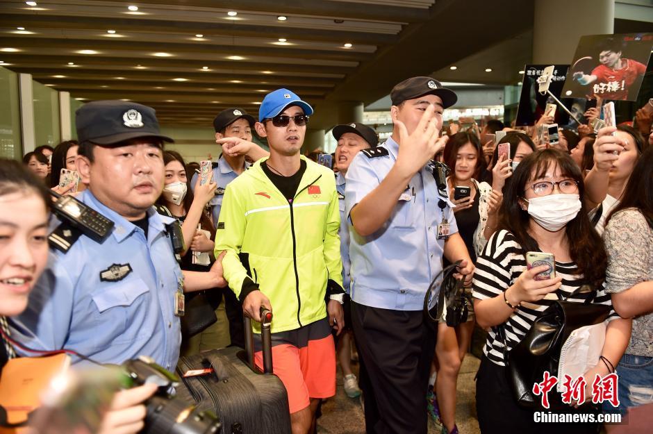 8月20日,包揽里约奥运4枚金牌的中国乒乓球队抵达首都机场,受到球迷的热情追捧。图为张继科出现在首都机场,被大批媒体和球迷包围。中新网记者 金硕 摄