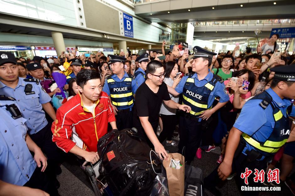 8月20日,包揽里约奥运4枚金牌的中国乒乓球队抵达首都机场,受到球迷的热情追捧。图为马龙出现在首都机场,被大批媒体和球迷包围。中新网记者 金硕 摄