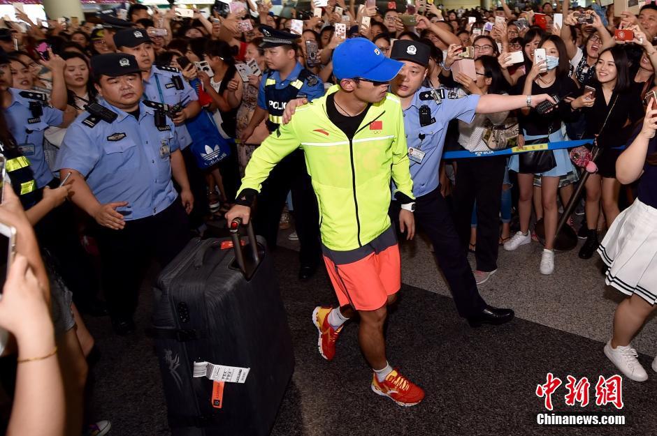 8月20日,包揽里约奥运4枚金牌的中国乒乓球队抵达首都机场,受到球迷的热情追捧。图为张继科出现在首都机场,被大批媒体和球迷包围。中新网记者 金硕 摄