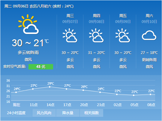 市气象台发布06时预报:今天白天多云转阴,西部北部山区有阵雨或雷阵雨,北转南风二三级,最高气温30℃;夜间阴(南部地区有阵雨)转晴,南风二级左右,最低气温21℃。中午前后气温较高,空气干燥,注意补水润燥。明后两天西部北部有阵雨或雷阵雨天气,请关注临近预报。