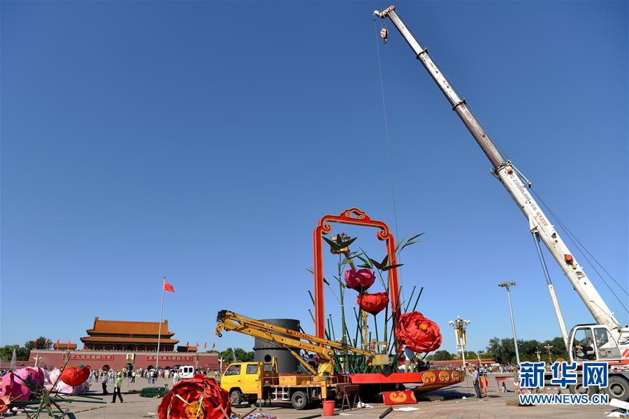 9月19日,工人们在天安门广场安装“祝福祖国”巨型花坛。当日,2016年国庆节天安门广场“祝福祖国”中心主花坛开始吊装。据介绍,花坛高度达17米、篮体高15.3米、直径50米,其内扦插300多枝仿真花,花材以牡丹、玉兰、荷花、月季为主,篮体镶嵌有“祝福祖国”和“欢度国庆”文字及1949至2016的年号,表达对祖国的美好祝福。花坛施工预计周末结束。新华社记者 李鑫 摄