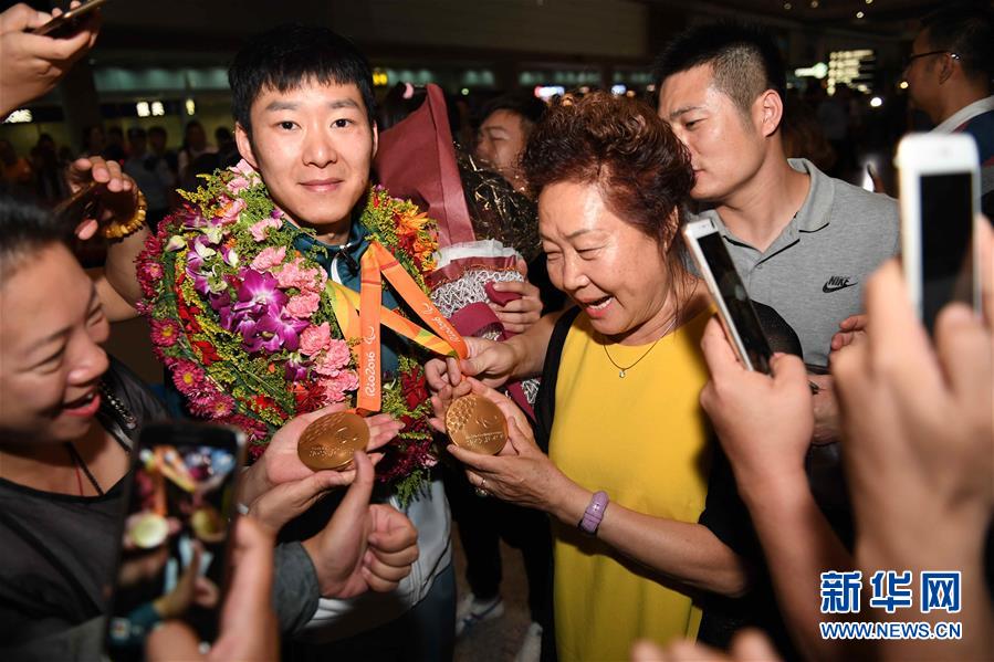 9月20日,接机群众与里约残奥会男子乒乓球冠军葛杨(左二)合影。当日,里约残奥会中国代表团抵达北京首都国际机场,受到接机群众的热烈欢迎。 新华社记者贺长山摄