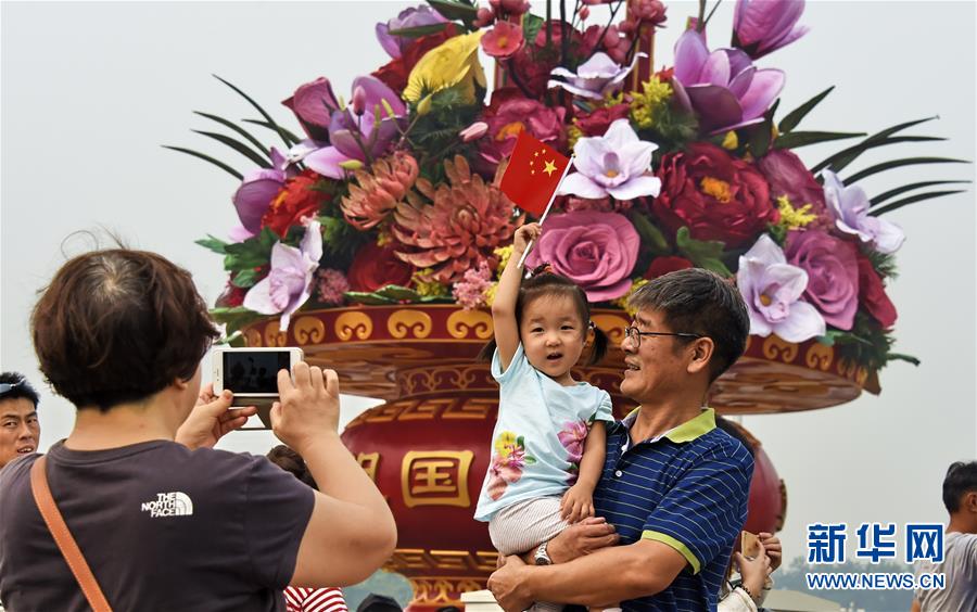 9月25日,游人在天安门广场“祝福祖国”大型花坛前留影。