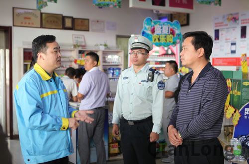 豆各庄地区办事处主任于建国(右)与城管队员在孙家坡加油站检查安全情况