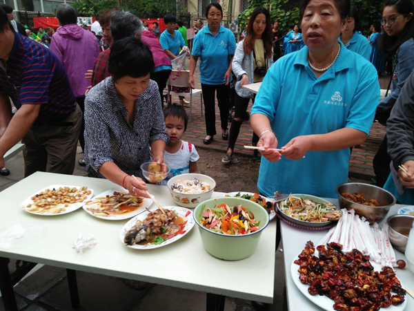音乐响起,活动在演员的歌声中拉开了序幕,居民们有序的围在餐桌前夹着自己喜爱的菜,这个阿姨说,这个菜做的不错,那个叔叔说,我最爱吃这个菜,小朋友们也争着要夹菜。现场充满欢乐的气氛。居民们品尝着菜肴观看着自编自导自演的节目真是不亦乐乎。