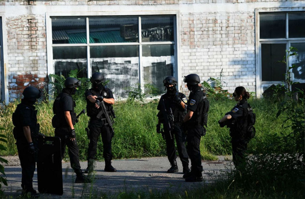 蓝剑突击队员在进行摸拟战术训练。