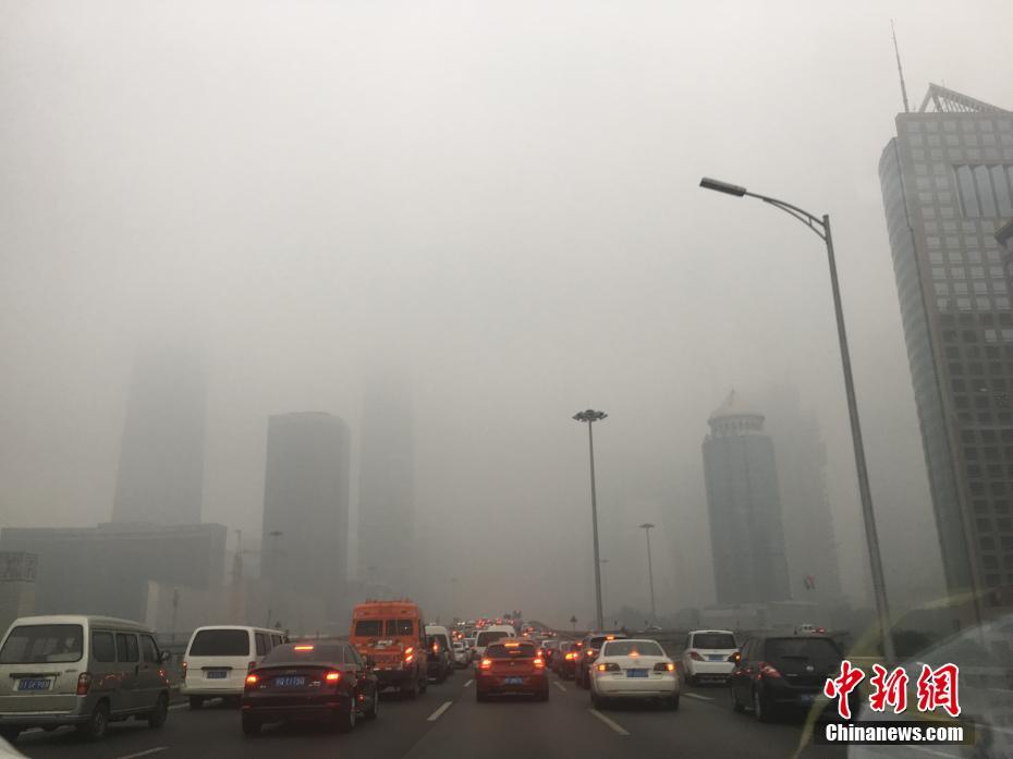 10月19日消息,昨天16时,北京市气象台发布霾黄色预警信号,预计昨日傍晚至19日北京大部地区有中度霾,南部地区有重度霾。通州、大兴区气象台也在16时前后发布霾橙色预警信号。截至16时,城六区PM2.5浓度已经超过150微克/立方米,达到5级重污染。图为国贸附近被雾霾笼罩,能见度降低。富田 摄