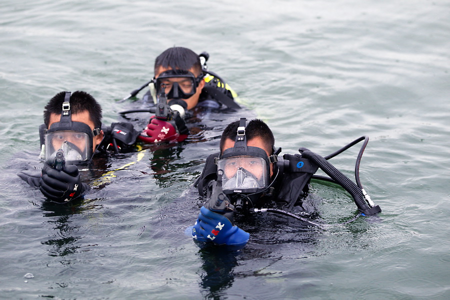 有的水底环境特复杂,生活垃圾不说,有些建筑废料、钢筋水泥块、破自行车什么都有,把脚扎了、把手划了,这都是常事儿。图为队员在训练。通讯员 张岩 摄