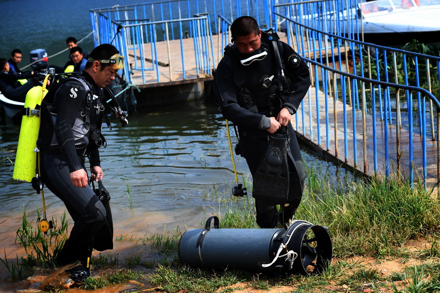 北京市公安局特警总队第五支队潜水大队的队员进行入水准备。通讯员 张岩 摄