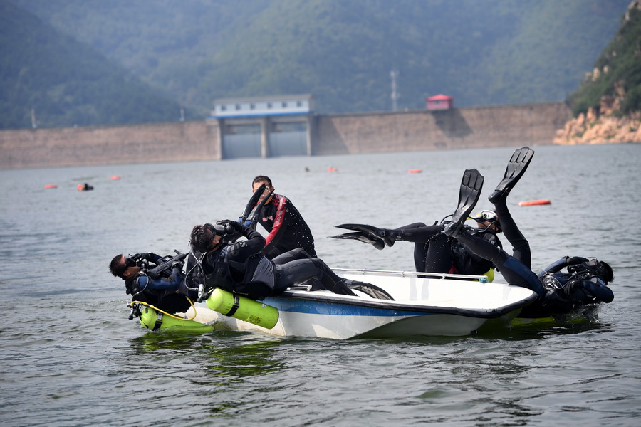 北京市公安局特警总队第五支队潜水大队的队员进行入水训练。