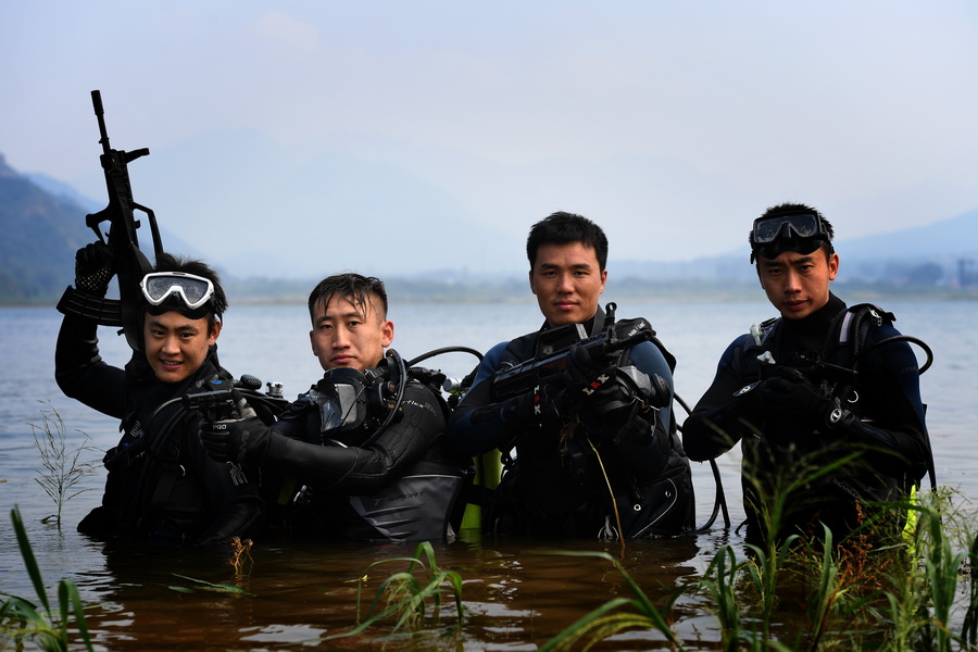 北京市公安局特警总队第五支队潜水大队的队员进行水中训练。