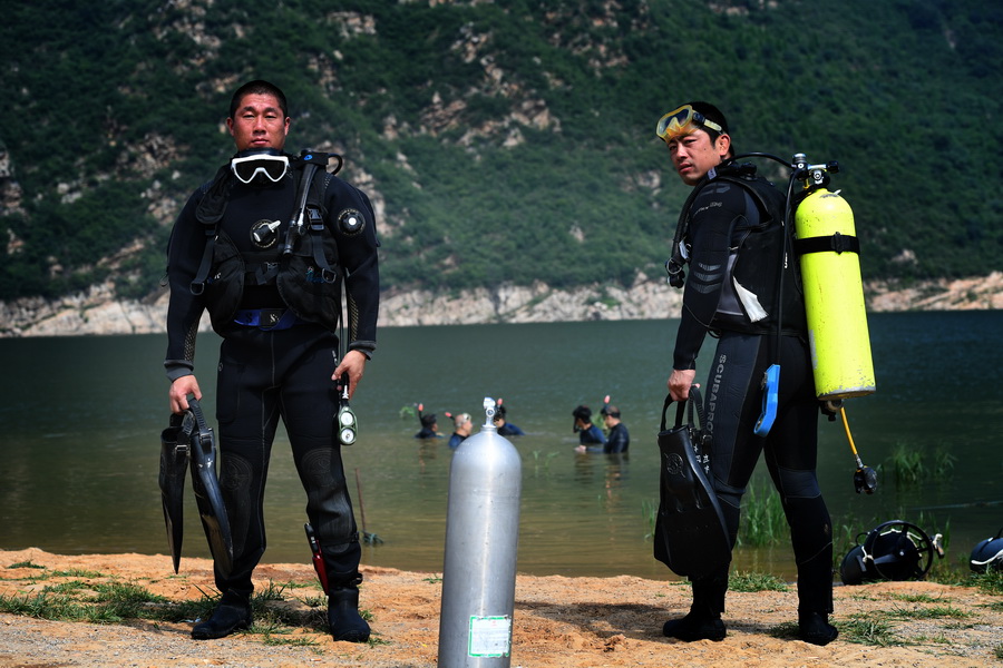 队员换上潜水衣,背起16公斤重的气瓶,还要在腰间坠上相当于体重十分之一的铅块。只有达到足够配重,才能潜得下去。通讯员 张岩 摄