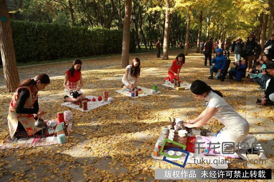 身着旗袍的美女在银杏大道上表演茶道 摄影 王冉