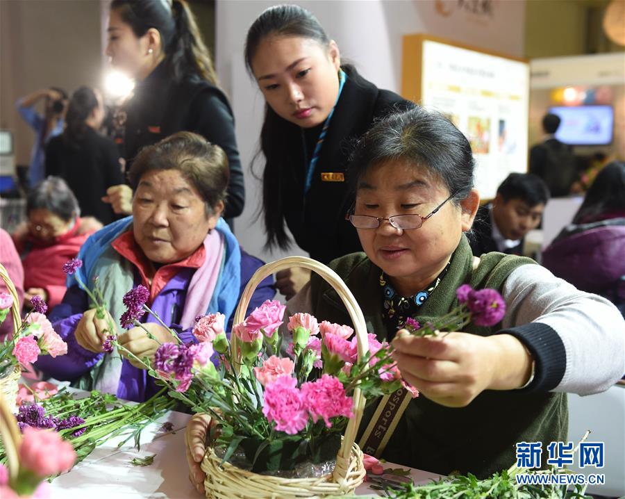 11月10日,在第五届北京国际老龄产业博览会上,一家养老机构工作人员现场教老人插花。