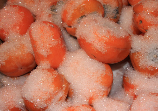 以前的老北京也有自己冬日水果,如冻酸梨和冻柿子。“冻柿子”是老北京特有的吃法,要霜降后才摘的柿子,冷冻储存到冬天,此时里面只剩一包水,只能吸食。先喝汁后吃皮,甘甜如蜜清凉适口,令人顿觉舒畅,火气渐消。所以老北京把它叫“喝了蜜”。冻柿味甘性寒,具养肺胃之阴,宜火燥津枯之体,不仅可解生火取暖的毒气,还能润喉止咳,为败火佳果。又因价格便宜,就成为老北京冬季里的必食之物,堪称物美价廉的保健水果,正所谓“一方水土,养一方人”。连清代学者王士雄都称它为“果中圣品”。