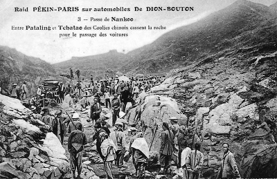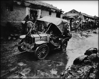 ▲迪昂车队在南口附近陷入泥坑,不得不找当地人用绳子将车拖出。