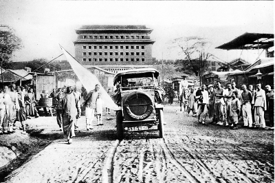 ◀意大利车队通过东四牌楼,两边挤满了看热闹的人。
