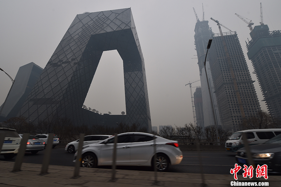 中央气象台12月12日清晨6时继续发布霾橙色预警,预计12日8时至13日8时,北京有中到重度霾,局地能见度小于1公里。图为雾霾中的央视大楼。 中新网记者 金硕 摄