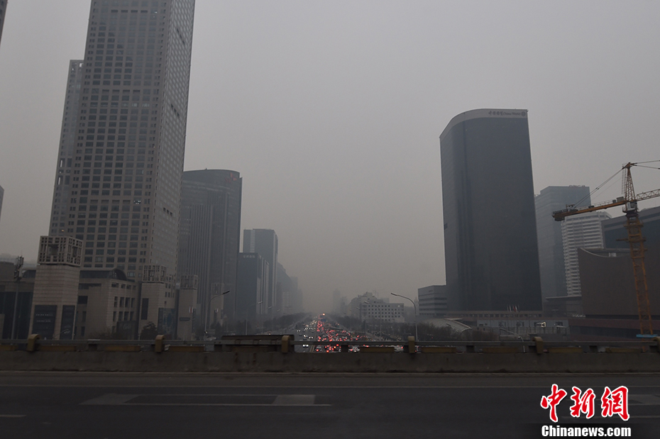 中央气象台12月12日清晨6时继续发布霾橙色预警,预计12日8时至13日8时,北京有中到重度霾,局地能见度小于1公里。图为北京东三环附近。 中新网记者 金硕 摄