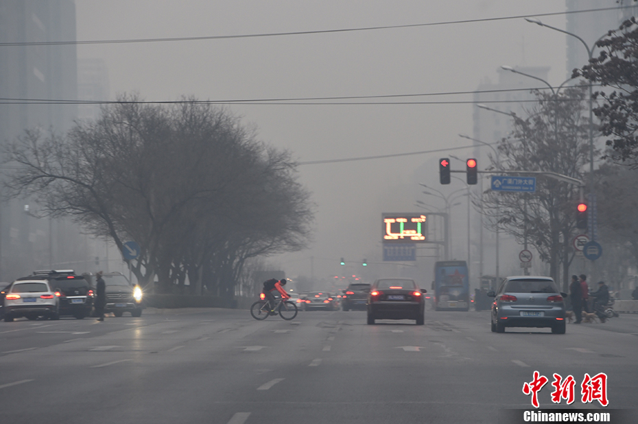中央气象台12月12日清晨6时继续发布霾橙色预警,预计12日8时至13日8时,北京有中到重度霾,局地能见度小于1公里。图为北京街头能见度很低。 中新网记者 金硕 摄