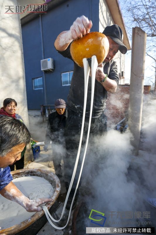 随着刘师傅手的震动,银白色的粉条从瓢的底部漏出,淀粉似一根根的银线在空中划出美丽的弧度,缓缓地从空中落入滚开的锅内,大铁锅里冒出热气腾腾的水蒸气将掌瓢师傅身影笼罩其中,雾气昭昭,时隐时现,眼前的一切幻化成一幅美丽的劳动乐章。千龙网友 天眼摄郎 摄