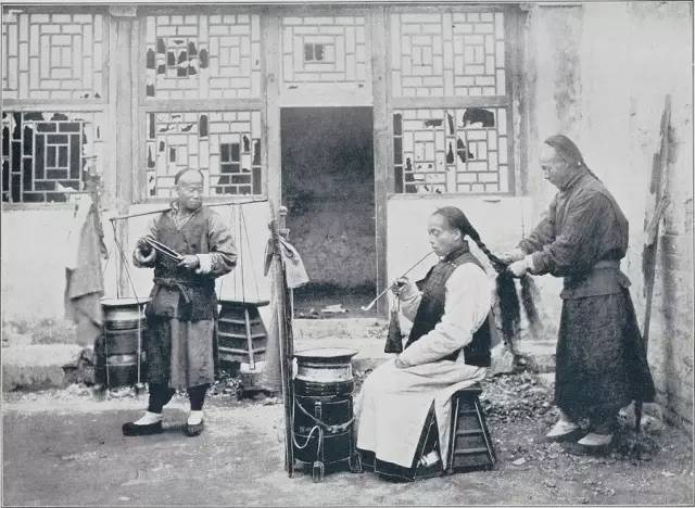 正在编辫子的一看就是位爷,因为人家穿着马褂呢~而剃头匠的衣服明显不咋样