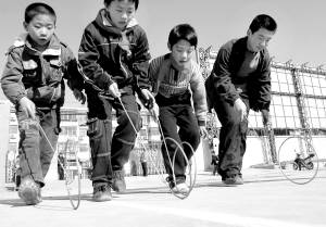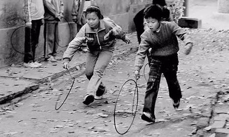 滚铁环的环是个约一尺多周圆的铁圈,其厚约一厘米,另有一个一尺多长的铁钩。