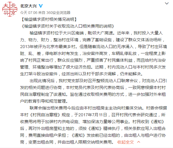 千龙网北京讯 7月15日7时许,#北京大兴#官微发布消息,对榆垡镇求贤村收取流动人口相关费用一事进行说明,全文如下: