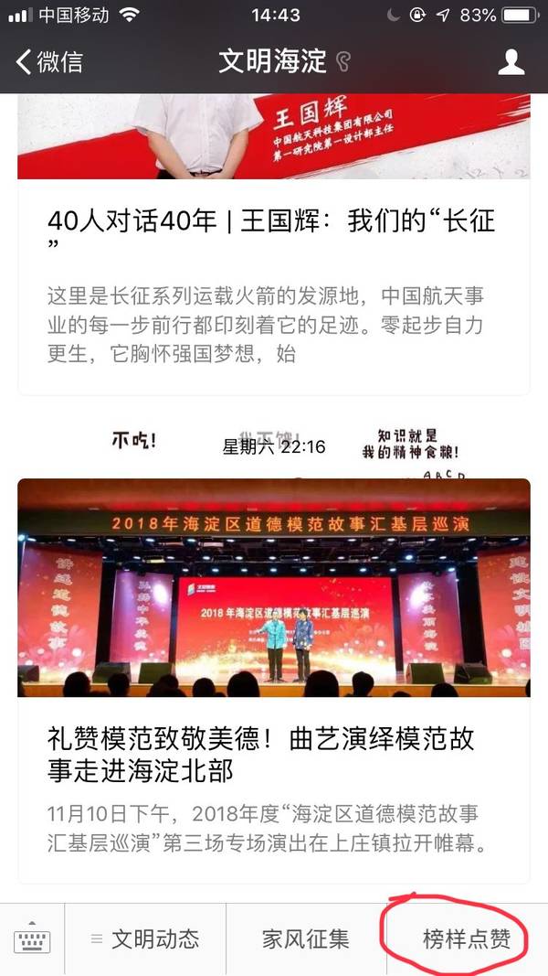 2、还可关注“文明海淀”微信公众号,点击“榜样点赞”栏目,为榜样点赞留言。