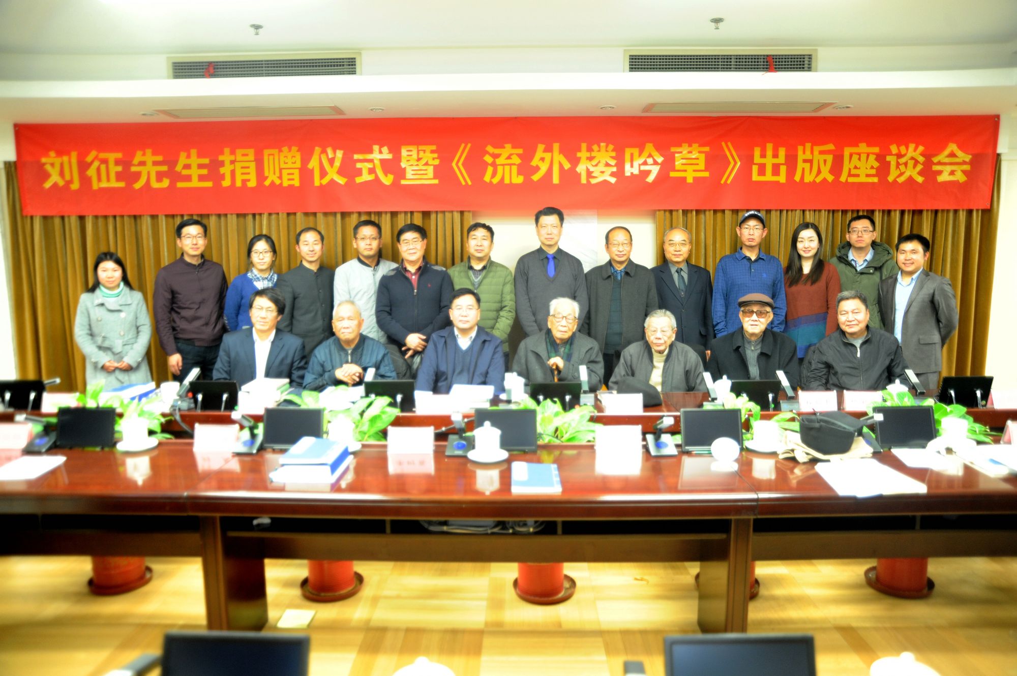 2017年2月,刘征先生和夫人李阿龄女士向中华诗词研究院表示,有意愿将刘先生手稿、全部藏书及部分藏砚、自作书画等无偿捐献给中华诗词研究院,以弘扬中华传统诗词文化,推动当代中华诗词事业。中华诗词研究院旋即复函,并委派专人与刘征先生接洽,商谈其图书、字画等捐赠工作事宜。迄今,刘征先生分批向中华诗词研究院捐赠其诗词手稿《流外楼吟草》等图书近数千册,自作书画近百轴,以及侯一民先生作刘征油画像1件、臧克家、程光锐、欧阳中石、沈鹏等四位先生分别赠送刘征先生的砚台。《流外楼吟草》以毛笔写成,线装四函十六册,是刘征先生从上世纪八十年代至本世纪初三十年间的诗词手稿合集,既呈现了作为书法家的刘征的书法风格及其演变轨迹,也记录下作为诗人的刘征的诗词创作心路历程,具有较重要的文学文献价值。