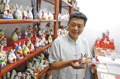 张忠强位于虎坊桥的工作室摆着兔儿爷。