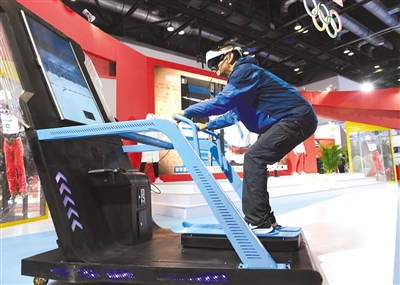 昨日,2019年国际冬季运动(北京)博览会开幕。一位参观者在VR模拟滑雪机上体验。新京报记者 吴宁