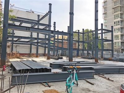 10月16日,涉事小区停车场内一些钢筋架已经竖立,另外还有一些摆放在地上,场内没有工人施工。新京报记者 张静姝 摄 新京报