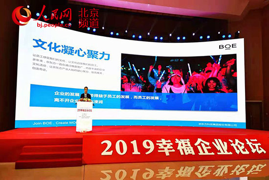 作为“建设幸福企业优秀单位”代表,京东方科技集团执行副总裁、首席人事官仲慧峰在优秀案例分享环节表示,“尊重人、一视同仁、激发创造力”是京东方长久以来的用人之道。 2019年10月1日,3290块折叠手持光影屏亮相天门广场中华人民共和国成立70周年庆祝活动现场,这项拼接阵列智慧显示软硬融合系统解决方案,正是出自我们京东方,这一亮相,不仅让我们的每一位员工为之骄傲,更向中国乃至世界展示了中国高科技企业的崛起和发展。我们坚信,员工强则企业强,企业强,则国强。